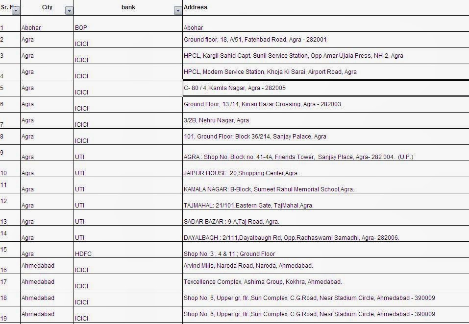 Free Download ATM Center List of BOP, ICICI, UTI, HDFC, IDBI, SCG, CENTURIAN, HSBC, Abu Dhabi Commercial Bank, Allahabad Bank, Bank Of Bahrain & Kuwait B.S.C, Bank Of Baroda, Bank Of India, Bank Of Maharashtra, Canara Bank, Central Bank Of India, Corporation Bank, Dena Bank, Federal Bank, Greater Bombay Co-Operative Bank, Indian Bank, Indian Overseas Bank, Janata Sahakari Bank, Lakshmi Vilas Bank, Nedungadi Bank, Oriental Bank Of Commerce, Punjab & Sind Bank, Punjab National Bank, Ratnakar Bank Ltd., SBI Commercial & International Bank, State Bank Of Hyderabad, State Bank Of India, State Bank Of Mysore, State Bank of Travancore, Syndicate Bank, UCO Bank, Union Bank Of India, United Bank of India, United Western Bank & Vijaya Bank in India in word / doc/ pdf/ ppt / excel format