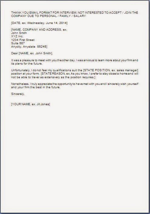 THANK YOU EMAIL FORMAT FOR INTERVIEW, NOT INTERESTED TO ACCEPT / JOIN THE COMPANY DUE TO PERSONAL / FAMILY / SALARY