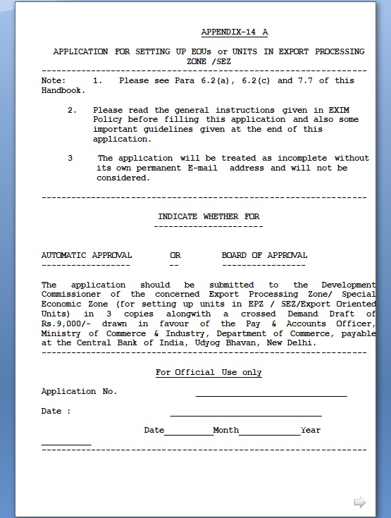 The application should be submitted to the Development Commissioner of the concerned Export Processing Zone/ Special Economic Zone (for setting up units in EPZ / SEZ/Export Oriented Units) in 3 copies alongwith a crossed Demand Draft of Rs.9,000/- drawn in favour of the Pay & Accounts Officer, Ministry of Commerce & Industry, Department of Commerce, payable at the Central Bank of India, Udyog Bhavan, New Delhi.
