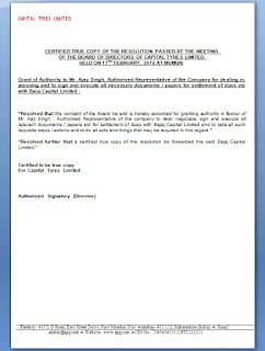 “Resolved that the consent of the Board be and is hereby accorded for granting authority in favour of Mr. Aaji Singh, Authorised Representative of the company to deal, negotiate, sign and execute all relevant documents / papers etc for settlement of dues with Bajaj Capital Limited and to take all such requisite steps / actions and to do all acts and things that may be required in this regard.”